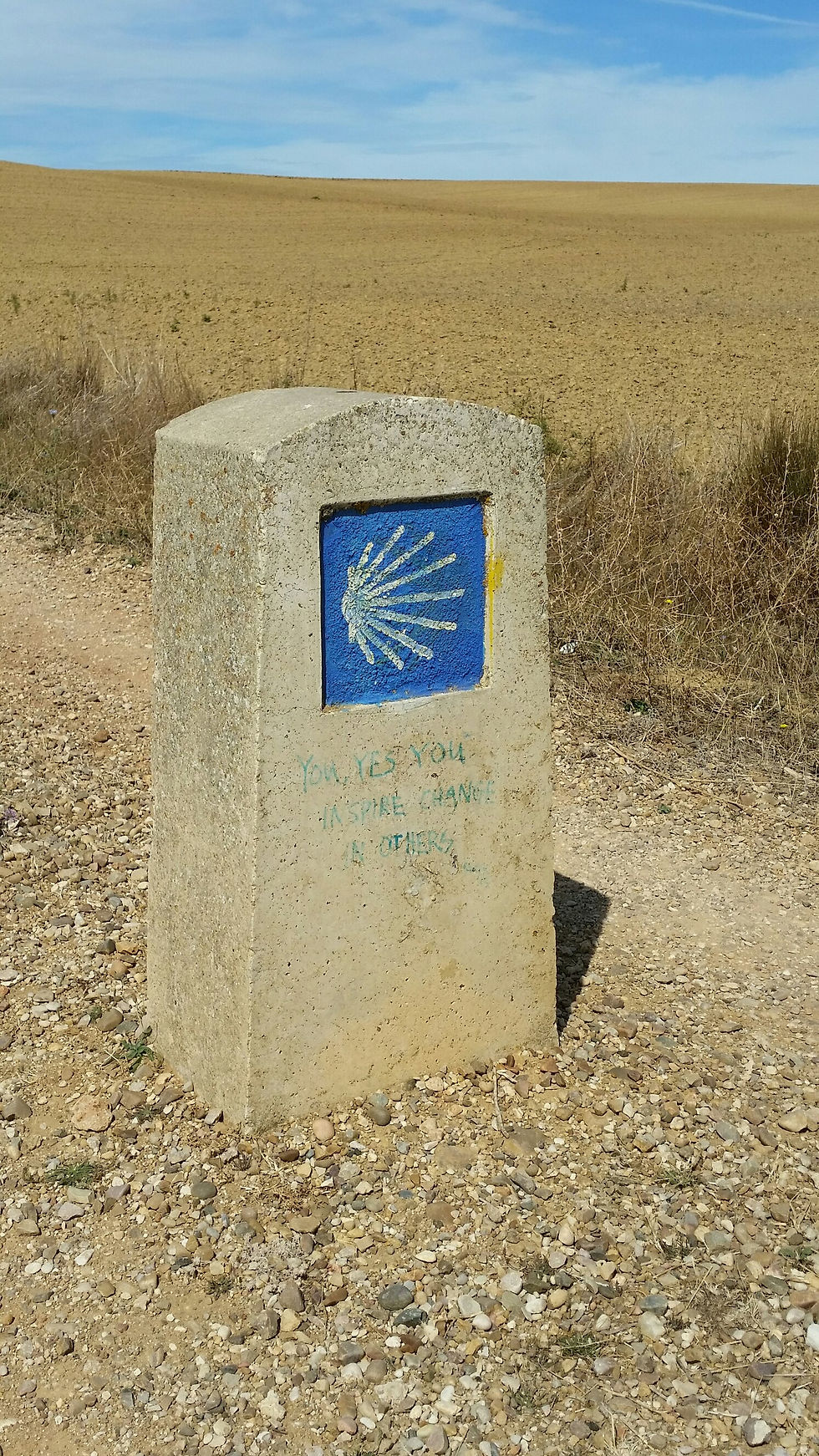 The next part was strolling along the side of a highway. I was absolutely mesmerized by the jet contrails across the sky. I even took the time to stop and pick flowers and someones quotes on the camino signs made me smile. I really really liked the pray for your enemies one. And then you inspire change in others, was pretty appropriate for this trip i thought.