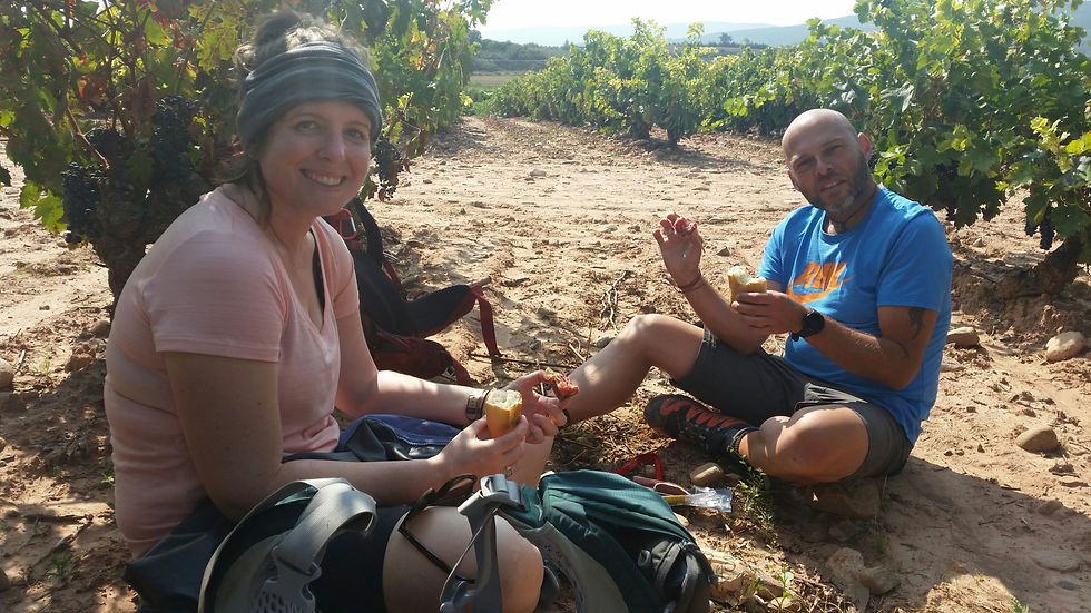 Yesterday was the toughest day on the camino so far. Maybe cause its day 8 and weve walked close to 200km. Maybe cause i finally have blisters on my toes, in between my toes, on my soles and on my heels. Or maybe it was cause we had walked 30km the previous day and knew we had to walk another 30km today. Except we didnt walk 30km. We walked 38km! Nothing is more soul destroying then walking all day in the scorching sun, blisters, carrying a pack, getting so excited with the 1km to go sign ,arriving into the town and finding out every albergue and hotel is full. Everything. We all kind of just sat outside the full albergue in despair contemplating a night in the park or moving on to the next town 6.5km away. I had nothing left in me! I could hardly walk but when the option of catching a taxi or walking came up. There was no choice. We put our packs on and headed off again into the hot afternlln sun. The scenery was beautiful those, red hills, vineyards everywhere. the last 6km was just on a small road between villages of which i begrudgingly dragged my feet every metre of the way! Why was i doing this to my self!?!? Its funny because the people you are walking with, were complete strangers 1 week ago and now theyre witnessing you throw a good tantrum and damn near cry. But do they care? No. Do they judge? no. Helmutt offers me his last energy bar, raph stops with his arms wide open and waits for me to reach him to give me a big hug, then amps you up and walks holding your hand to make you push on. We finally, just after 6pm (11hrs of walking and one near vomit break) stroll into the albergue and all just drop everything, sitting in silence. Staring at the floor. Wrecked. –/–